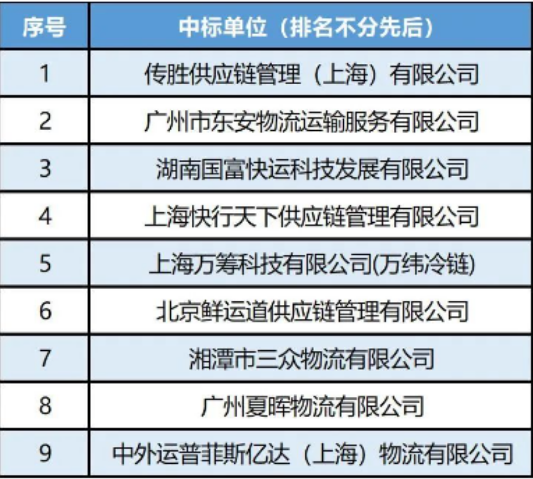 據(jù)介紹,本次招標(biāo)吸引來自全國各地包括順豐、中外運、新夏暉、萬緯物流、傳勝供應(yīng)鏈、快行天下等知名企業(yè)在內(nèi)的共57家企業(yè)報名,通過資格審查24家,最終到場參與開標(biāo)的24家(23家現(xiàn)場、1家線上),經(jīng)過評審小組的多輪評審及議價,結(jié)合投標(biāo)單位服務(wù)調(diào)配能力、線路覆蓋網(wǎng)絡(luò)、服務(wù)價格等三方面進行綜合考量并最終確定以下9家單位中標(biāo),分別如下: