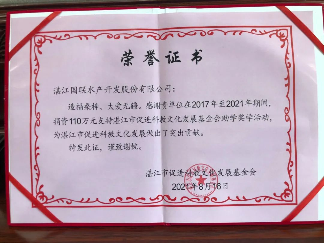 扶貧先扶志,扶貧重扶智。據(jù)悉,國聯(lián)水產(chǎn)集團(tuán)先后共捐贈(zèng)慈善公益項(xiàng)目約4000多萬元。2021年,國聯(lián)水產(chǎn)集團(tuán)向湛江市促進(jìn)科教文化發(fā)展基金會(huì)捐款110萬元,為湛江科教文化發(fā)展盡心盡力。愛心無止境,公益事業(yè)亦無止境。未來,國聯(lián)水產(chǎn)集團(tuán)始終如一,將源源不斷的輸出愛心,聚沙成塔,以愛心繼續(xù)溫暖中華大地!